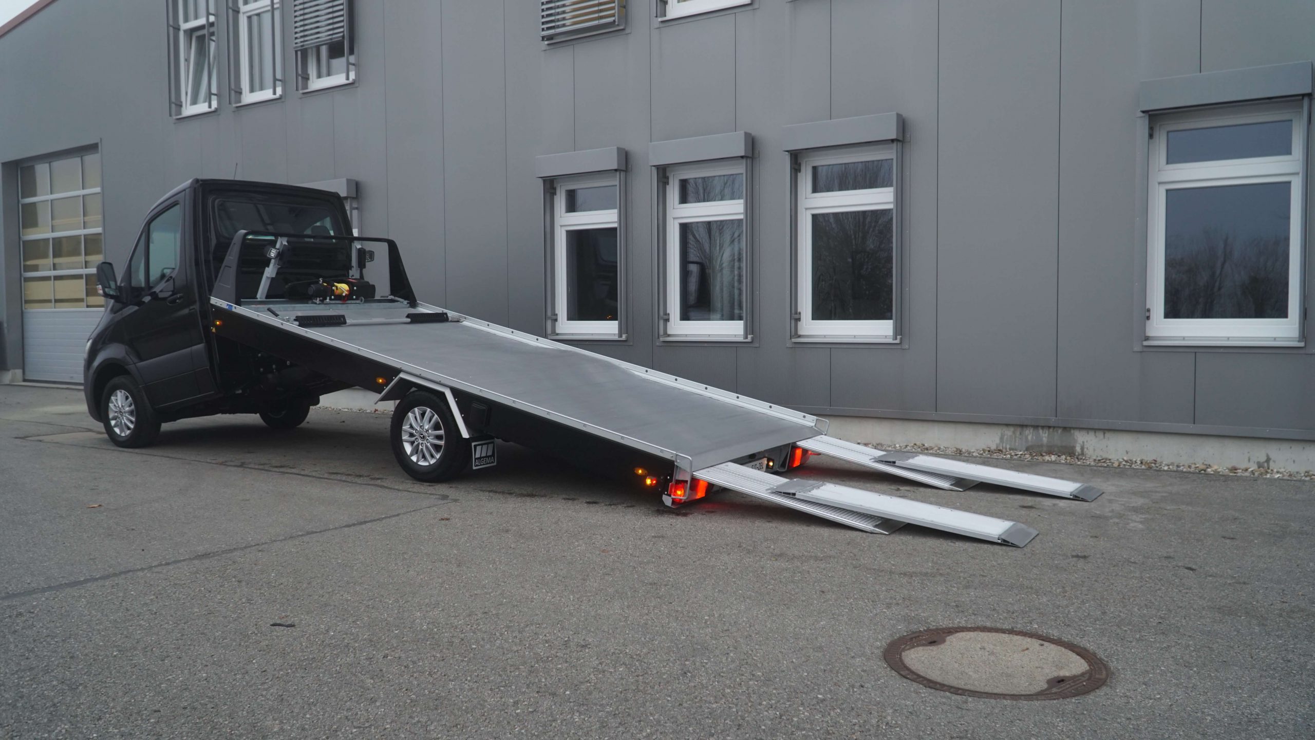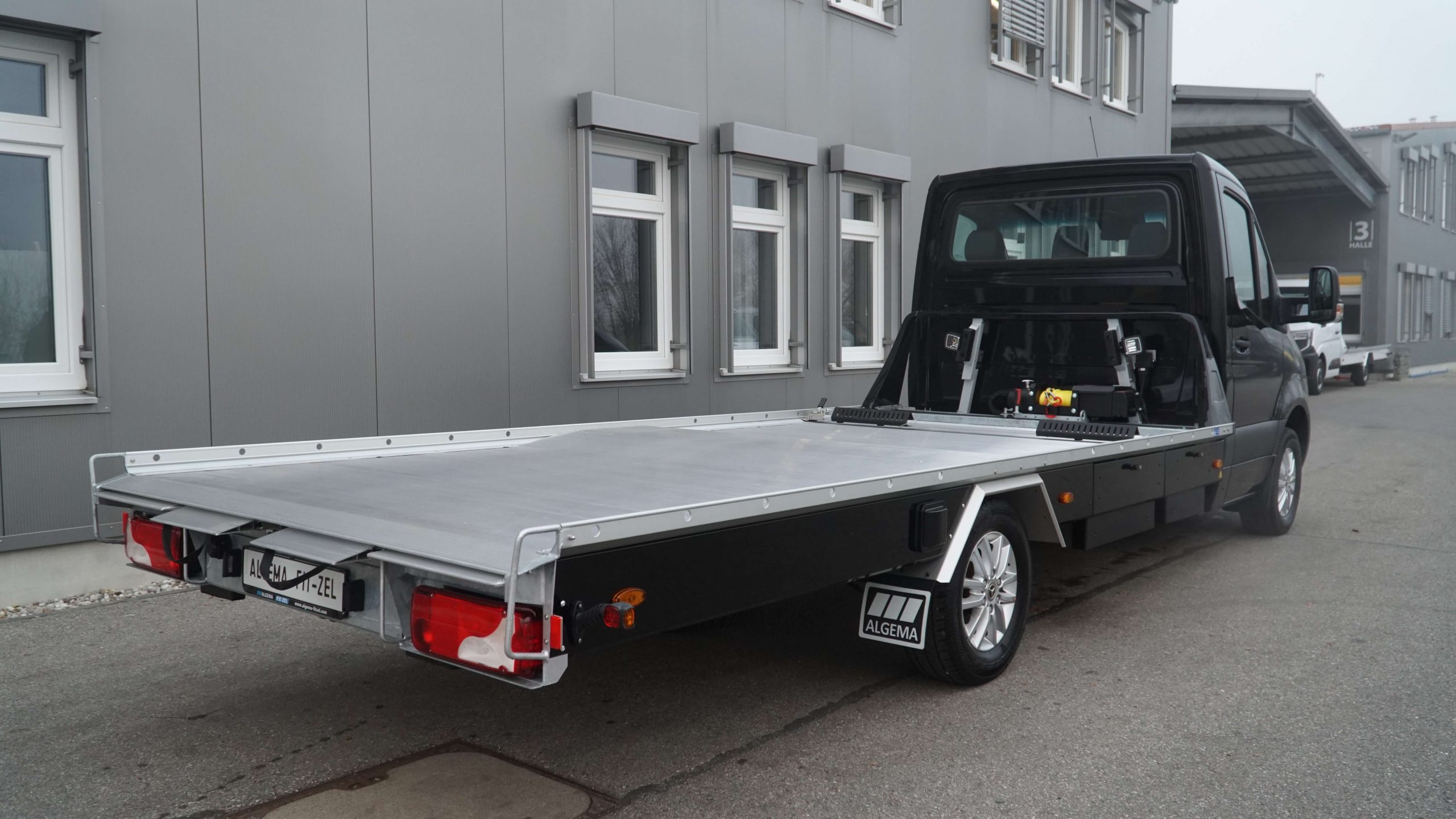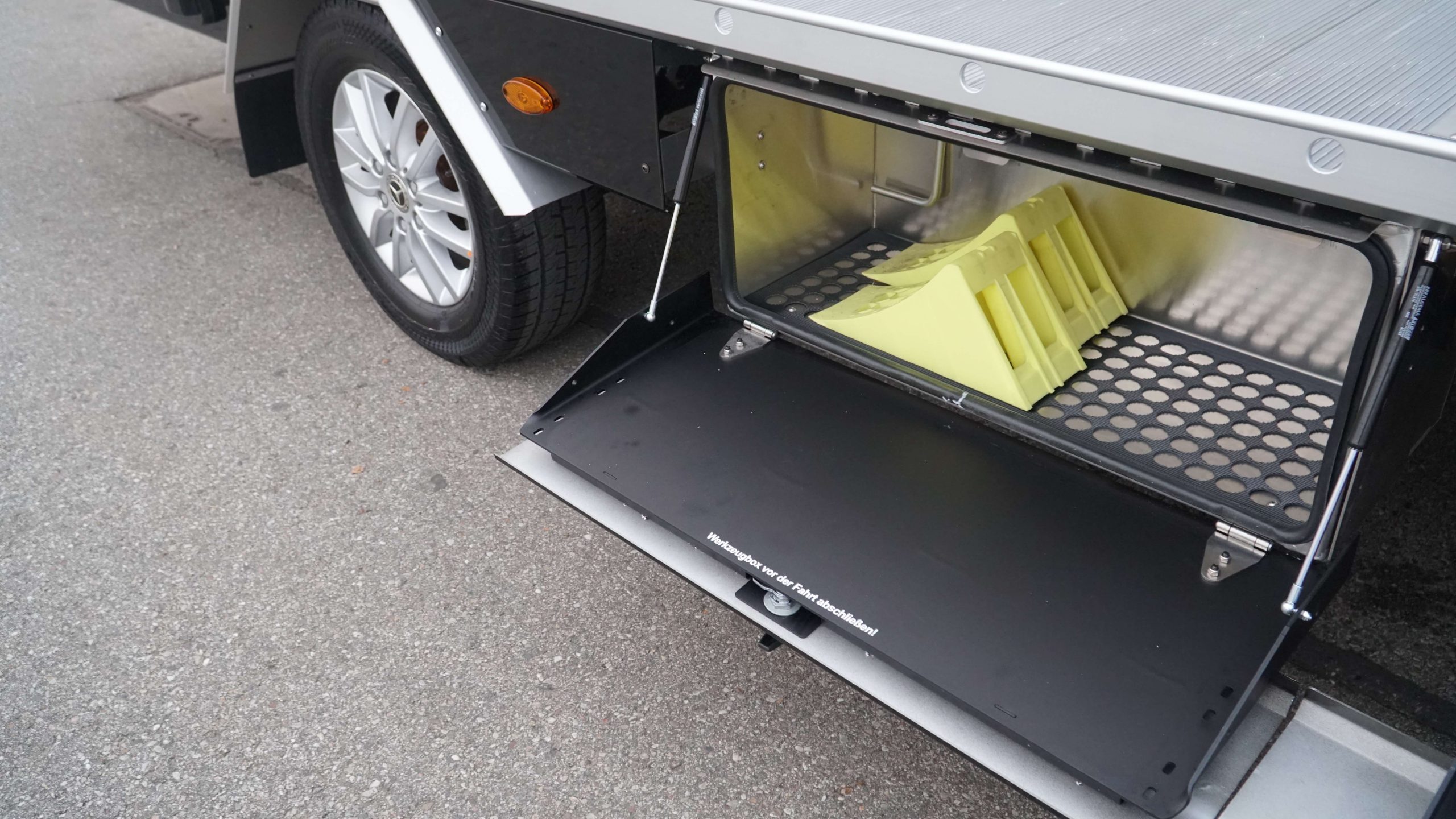 Serienausstattung - inklusive Luftfederung - Komplett mit Kippschere - Aufbau in Alu-/Stahl Compoundbauweise - Boden geschlossen mit Alu-Profilen mit Querrillen - 2 Auffahrrampen hydraulisch - 1 Werkzeugbox rechts - Alu-Radanschlagbügel - 1 Reserveradhalterung unter der Ladefläche - Anhängekupplung abnehmbar - Flyer klein - Arbeitscheinwerfer - E-Winde ComeUp inkl. Windenseil - Lackierung Seitenverkleidung